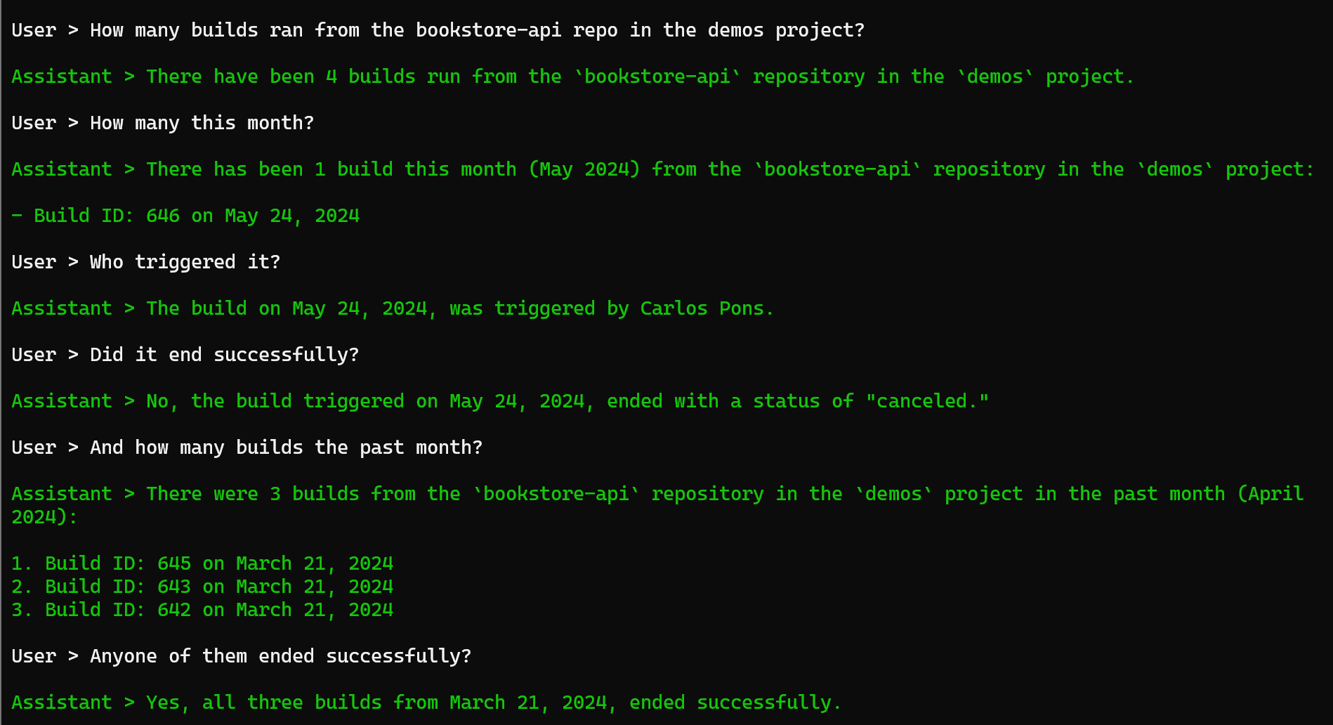AZURE_DEVOPS_PAT: A personal access token from your Azure DevOps instance. It is easier if it has full access permissions because we are going to make use of multiple endpoints of the REST API.AZURE_DEVOPS_ORG_URI: The URI of your Azure DevOps REST API. The format must be:https://dev.azure.com/{your-org}AZURE_DEVOPS_ORG_ALT_URI: The URI of your VSSPS Azure DevOps REST API. The format must be:https://vssps.dev.azure.com/{your-org}AZURE_DEVOPS_ORG_ALM_URI: The URI of your ALMSEARCH Azure DevOps REST API. The format must be:https://almsearch.dev.azure.com/{your-org}OAI_MODEL_NAME: The LLM name you’re going to use. In my case, I’m usinggpt-4o. You can use another one of the multiple available models in Azure OpenAI.OAI_ENDPOINT: The endpoint of your Azure OpenAI instance. It always has the same format:https://{service-name}.openai.azure.com/OAI_APIKEY: An Azure OpenAI Api Key.