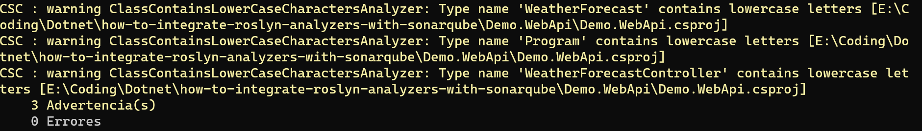 If we test the above Roslyn rule on a newly created .NET 7 API, here’s how the MSBuild output looks like: